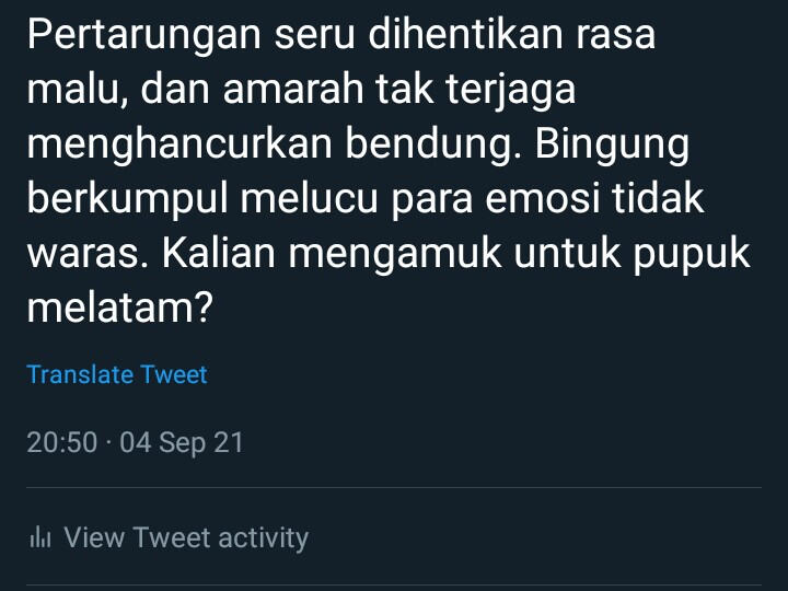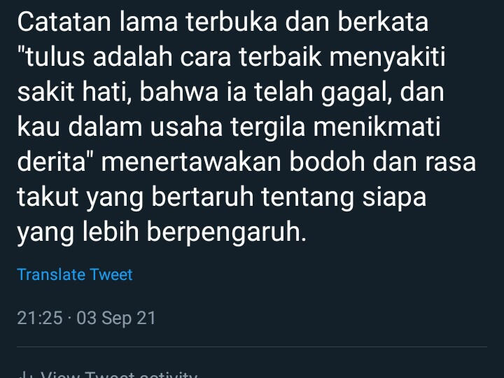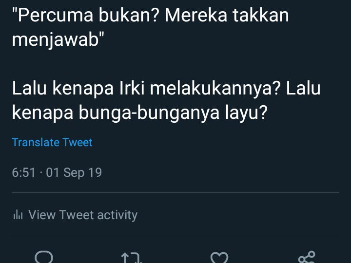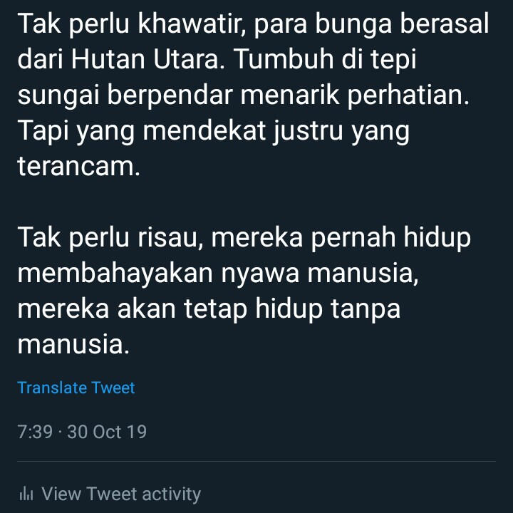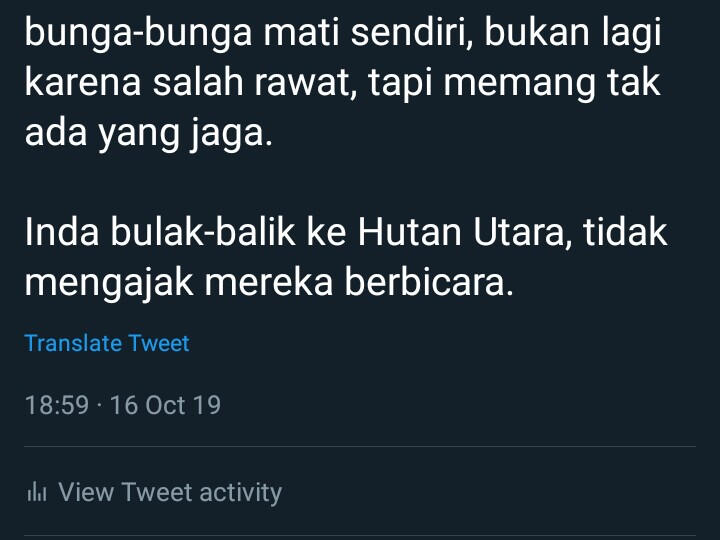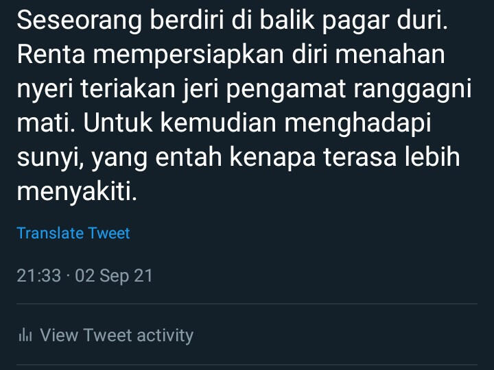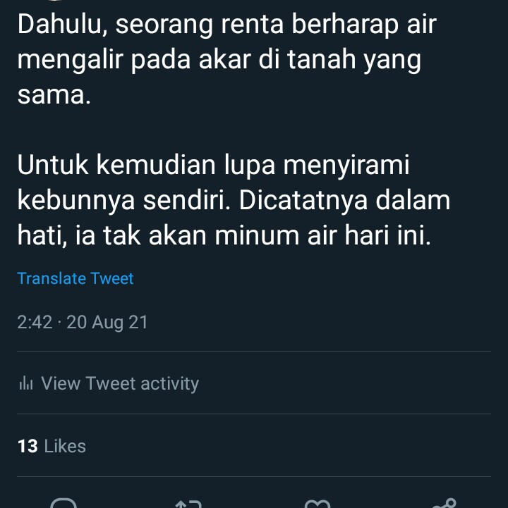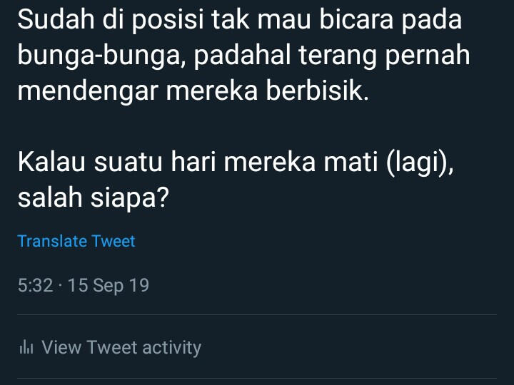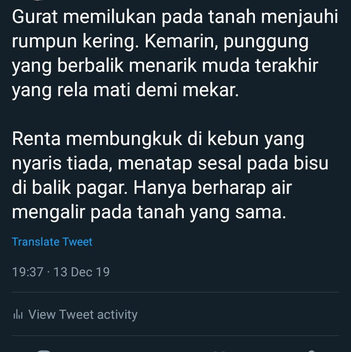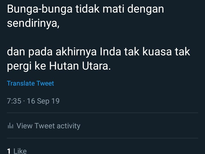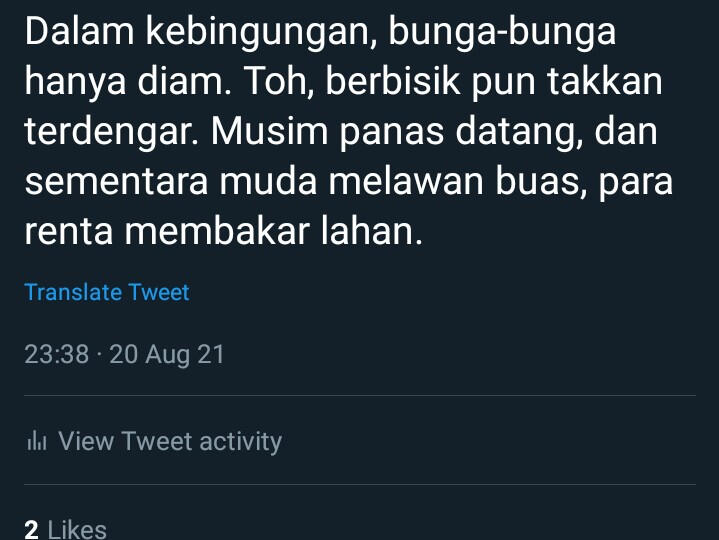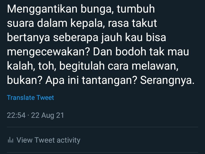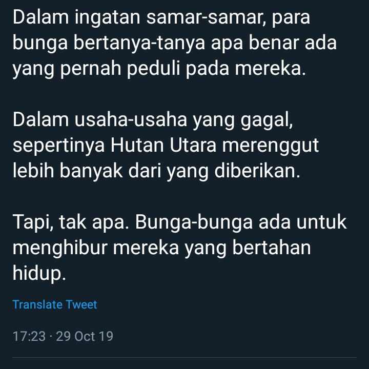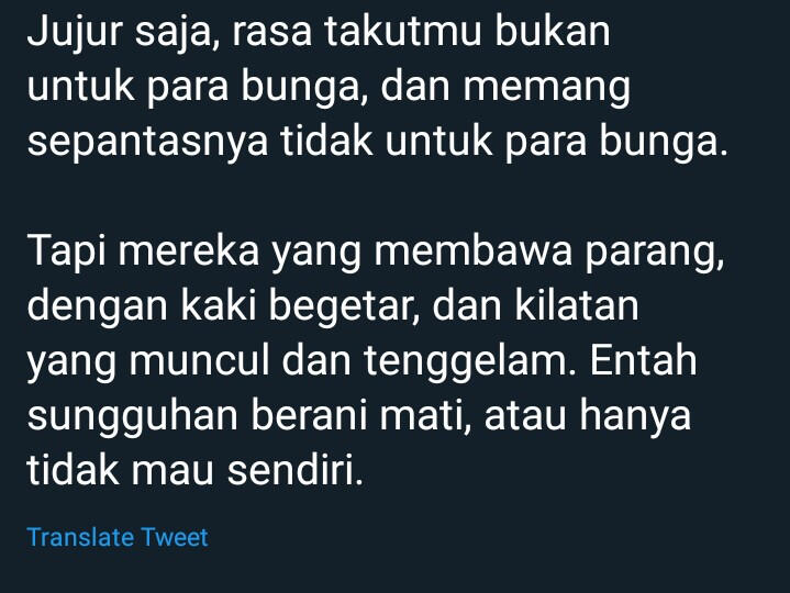 • Aku HidupInda di sini. Si bodoh itu masih hidup. Aku tak menyangka akan sebersyukur ini mengetahui dia benar-benar bebal soal bunga. Kau bisa tebak, dia mengambil melati yang tepinya kotor oleh tanah.Waktu aku datang setelah berlari karena surat bunuh dirinya. Dia sedang menyesap secangkir melati. Tersenyum berkata aku tak perlu repot-repot. Aku tak pernah melihatnya menunjukkan banyak perasaan kau tau, tapi kurasa si bodoh itu cukup pantas disebut dramatis.Intinya dia hidup. Hanya itu yang perlu kau tau.Catatan.