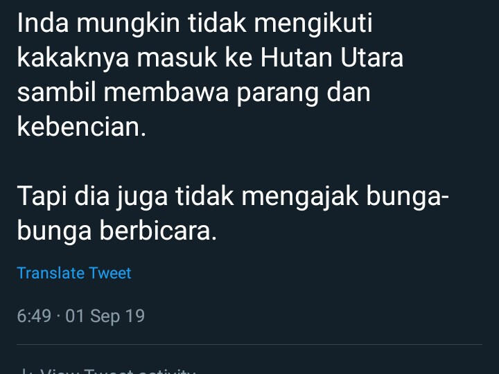 Permintaan terakhirku, dan permintaan terakhir kakakmu. Jangan mengikuti kebodohan kami datang ke Hutan Utara dengan parang dan kebencian. Jangan kecewakan kami dengan memulai kembali apa yang telah kami putus.Aku percaya padamu. Dan bukan karena aku mengenalmu. Bukan juga karena aku merasa kau akan melakukan apa yang aku pikir akan kau lakukan. Rasanya aneh menulis ini, tapi sama seperti kau percaya pada Irki, aku percaya padamu karena pada akhirnya hanya itu yang bisa kulakukan.Epilog(s)