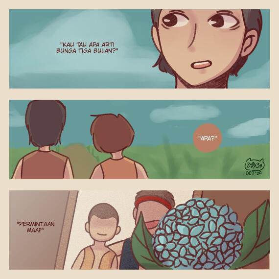 Hutan Utara mungkin awal perkenalan Irki denganku, tapi itu bukan awal perkenalanku dengan Irki.Keluarga Irki adalah satu-satunya yang menjual bunga. Orang-orang biasanya memiliki sawah, berternak, menanam sayur. Tapi keluarga Irki menjual bunga, dan mau tak mau jadi mencolok.Aku kebetulan satu kereta yang sama dengan Irki dalam pengiriman panen ke kota beberapa minggu setelah kami keluar dari Hutan Utara. Ini bukan pertama kalinya aku satu kereta dengannya. Tapi ini pertama kalinya dia menyapaku. Pertama kalinya juga bagiku memperhatikan karangan-karangan bunga yang akan dijualnya di kota."Kenapa bunga?" aku bertanya padanya waktu itu."Kenapa tidak? Mereka indah""Apa gunanya keindahan kalau kau mati kelaparan?"Irki nampak berpikir sebentar, lalu menjawab sambil melihat bunga-bunganya "Supaya kau tidak bersedih karena bertahan hidup" lalu ia tertawa seolah tidak baru saja mengatakan sesuatu yang mengerikan.Kami berpisah. Aku turun di pasar bersama sayur-sayuran untuk kujual ke tukang sayur. Sementara Irki melanjutkan perjalanan menuju istana. Penobatan Raja Manda akan dilakukan beberapa hari lagi. Mereka butuh banyak sekali bunga. Kadang aku heran kenapa mereka melakukannya, bunga mengundang kupu-kupu dan semua orang tau kalau keluarga kerajaan—ah, aku tidak boleh membahasnya.Kereta pulang ke desa akan berangkat besok pagi-pagi. Maka aku harus pergi ke rumah pamanku untuk menginap. Ini hal tidak biasa lainnya, sudah berlangsung beberapa bulan tapi aku masih belum terbiasa. Biasanya aku menginap di penginapan, setelah membeli kain dan makanan aneh, mampir sebentar di rumah paman, lalu kembali ke penginapan bersama ayah.Ah, lagipula aku tidak terlalu suka pasar. Terlalu ramai di sana.Rumah paman tidak jauh dari pasar, aku hanya tinggal berjalan kaki ke sana. Dan aku tidak terkejut ketika Irki tiba-tiba menyapaku dari belakang. Sepertinya muncul tiba-tiba sudah jadi kebiasaannya.Ia menarik sebuah gerobak kecil dengan banyak bunga di dalamnya, berkata hendak pergi ke rumah pamanku. Paman membeli beberapa bunga, perwakilan berkabung untuk ayah. Aku, kalau boleh jujur, merasa sangat skeptis soal hal itu—ah sudahlah. Aku tidak bisa terus menerus menyalahkan keadaan kan? Lihat Irki, senyumnya lebar sekali seolah ia tidak pernah memegang parang penuh kebencian hendak membalas dendam pada Baru.Konyol juga kalau dipikir-pikir. Reaksiku pada kematian ayah adalah bunuh diri. Reaksi Irki pada kematian ayahnya adalah dendam. Aku rasa itu menjelaskan banyak perbedaan di antara kami."Bunga apa yang dipesan pamanku?""Kuwalaya""Apa?""Aku bercanda. Dia memesan Bunga Tiga Bulan, lihat, yang warna biru itu"Aku curiga dia menyebut semua bunga yang berwarna biru sebagai Kuwalaya.Saat kami sampai di rumah paman, beliau menyambutku dengan pelukan dan air mata. Sudah seperti ini sejak aku harus ke kota sendirian karena ayah tidak kembali.Aku memperkenalkan Irki, paman bahkan memeluknya lebih erat. Ibu pasti mengirim surat bercerita soal kejadian bulan lalu, karena paman berterima kasih soal menyelamatkanku dari monster."Kau juga menginap lah di sini, anggap ini wujud terima kasih""Ah, tak usah repot-repot paman" Irki jelas menolak. Aku mengerti rasanya, dipuji atas sesuatu yang tidak dilakukan pasti terasa mengerikan "Lagipula aku masih harus mengantar bunga""Oh, setidaknya ikut makan malam bersama kami" pamanku adalah orang yang gigih. Ayah sudah berpengalaman seumur hidup menolak kebaikan hatinya, Irki jelas tidak ada apa-apanya.Irki terpaksa menyetujui yang satu itu. Lalu dia pamit."Aku akan membantu Irki menjual bunga"Dua orang itu tampak kaget. Aku memang tidak membicarakan ini dengan Irki. Terpikir begitu saja. Paman tersenyum, mungkin senang aku tak perlu berlama-lama di rumahnya.Kami pergi, tujuan Irki selanjutnya adalah perpustakaan kota. Aku tidak sadar bunga memiliki banyak sekali daya jual hampir di setiap bagian. Yang pasti aku tak pernah menjual sayur ke perpustakaan."Kau tak perlu begitu keras pada pamanmu" ucapan Irki disela-sela percakapan kami dalam menghilangkan bosan membuatku bingung."Aku tidak keras pada paman""Kau tidak membalas pelukannya, tidak tersenyum sama sekali padanya, dan langsung pergi dari rumahnya begitu ada kesempatan?" tambah Irki "Apa dia kakak ayahmu?""Bagaimana kau tau?""Maaf. Tapi apa kau terpikir, harusnya dia yang gugur?"Wajahku pasti terlihat mengerikan. Irki berkali-kali meminta maaf setelah mengatakan itu.Aku tidak pernah menceritakan ini pada siapapun. Tidak pernah juga berniat melakukannya. Aku mungkin kesal pada paman. Tapi bukan karena aku ingin dia mati menggantikan ayah. Dalam banyak kesempatan, aku lebih sering berpihak pada paman daripada ayah. Aku selalu setuju dengannya bahwa cara terbaik menangani Baru adalah pergi menjauh dari Baru. Aku kagum ketika dia memilih meninggalkan desa. Aku berharap paman bisa meyakinkan ayah untuk melakukan hal yang sama. Paman orang yang gigih, tapi ayah sudah berpengalaman seumur hidup menolak kebaikan hatinya. Aku mungkin kesal karena dia tidak berusaha lebih keras, padahal semua ini bukan salahnya."Kau tau apa arti Bunga Tiga Bulan?""Apa?""Permintaan maaf"Itu tidak mengubah apapun. Ayahku tetap pergi. Aku tetap ditinggalkan.Kami sampai di perpustakaan. Bangunan itu lebih besar dari yang aku kira. Pintunya memiliki dua daun dan tingginya mungkin sampai tiga depa orang dewasa. Ada ukiran di setiap kayu yang terpasang disana. Entah pintu, jendela, tiang, bahkan penyangga lentera. Yang menarik perhatianku sebenarnya adalah bunga-bunga yang ada di bawah setiap jendela. Untuk apa mereka membeli bunga lagi?Irki menyapa seorang anak yang sedang bermain tidak jauh dari sana. Dia memanggil seorang, tapi semua teman-temannya datang menghampiri."Bang Irki" sahut mereka kegirangan. Sepertinya Irki mengenal baik semua anak-anak kecil ini--aku tau aku juga anak kecil, tapi mereka jauh lebih kecil dariku--"Tolong jaga gerobakku ya"Mereka mengiyakan dengan antusias kemudian berbicara bersahut-sahutan tentang banyak hal. Aku kesulitan mend